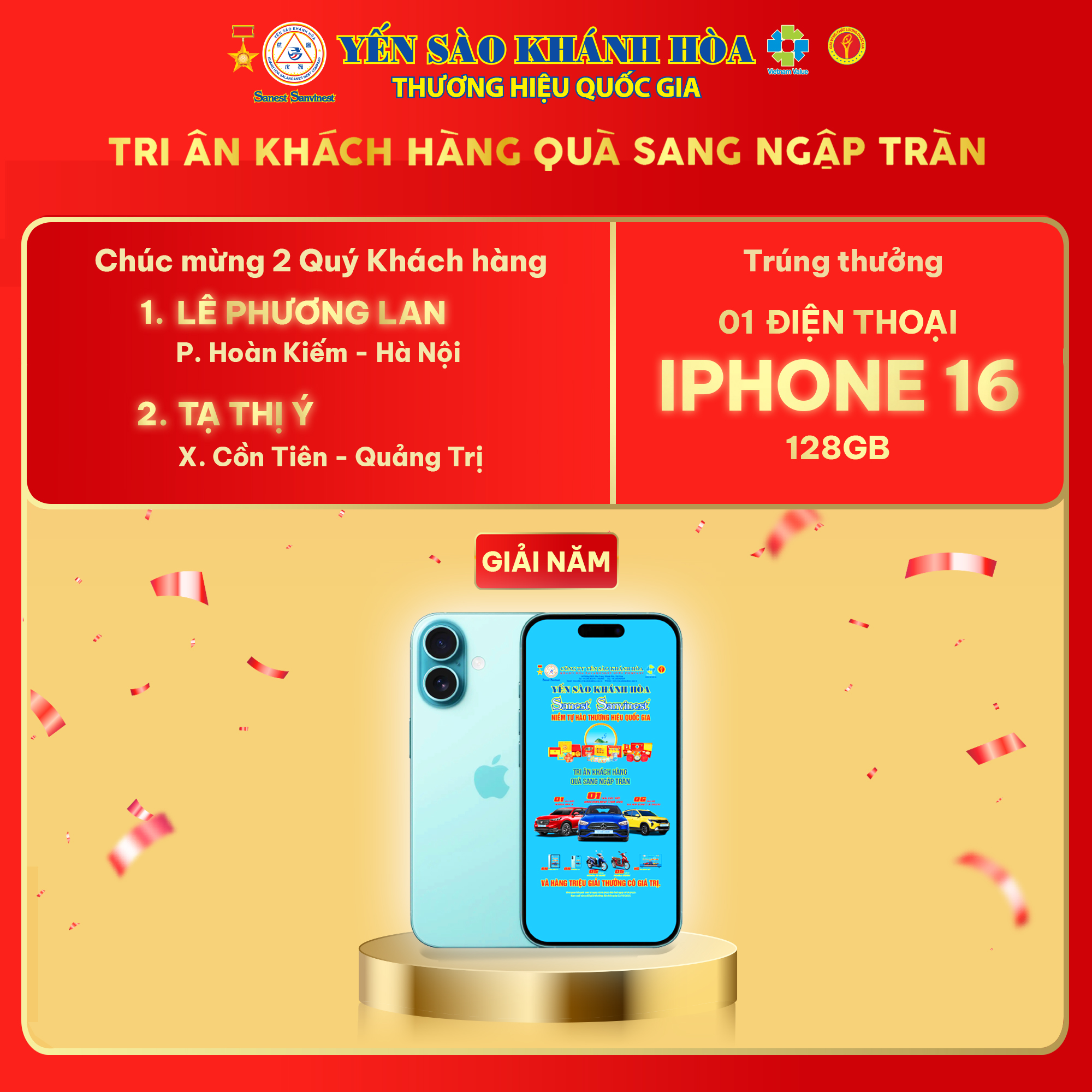 Chỉ với thao tác quét mã đơn giản Khách hàng: LÊ THỊ LAN (Hà Nội) và TẠ THỊ Ý ( Quảng Trị) đã may mắn sở hữu iPhone 16 128GB từ Công ty Yến sào Khánh Hòa.