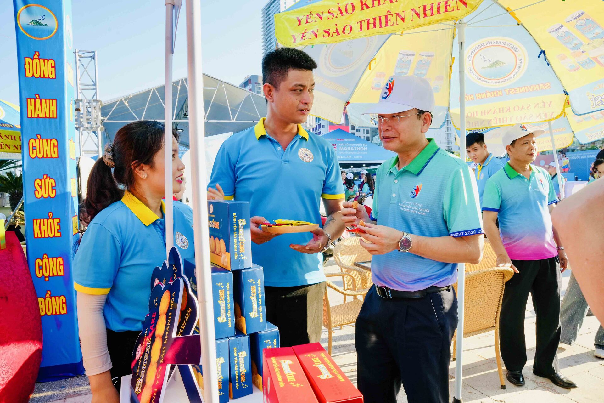 Chiều 28-3, trong khuôn khổ Giải vô địch quốc gia Marathon - Báo Tiền Phong lần thứ 67 năm 2026, Phó Chủ tịch UBND tỉnh Trịnh Minh Hoàng, Tổng Biên tập Báo Tiền Phong Phùng Công Sưởng và Ban Biên tập đã đến tham quan gian hàng Yến sào Khánh Hòa.
