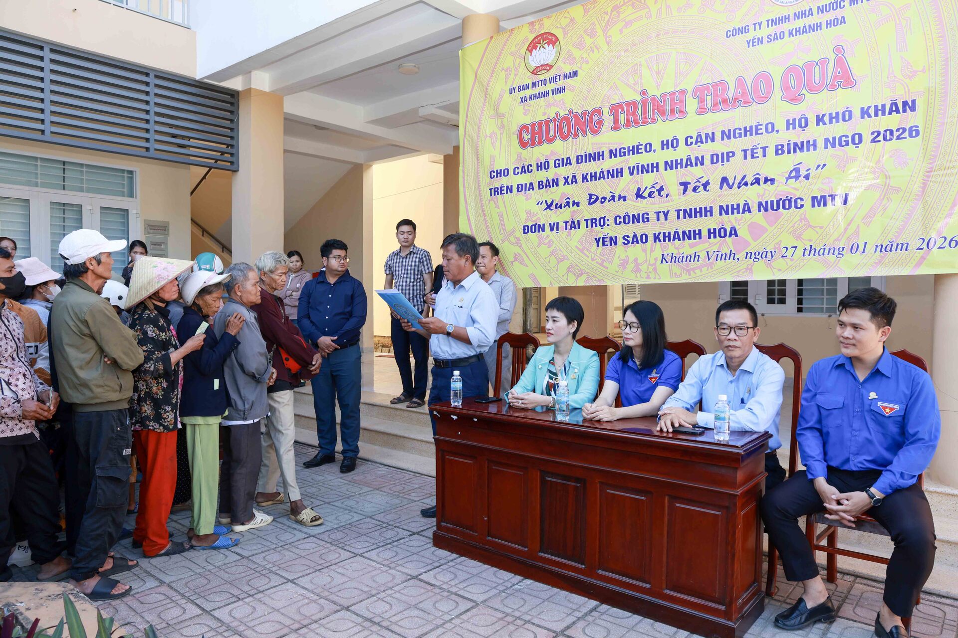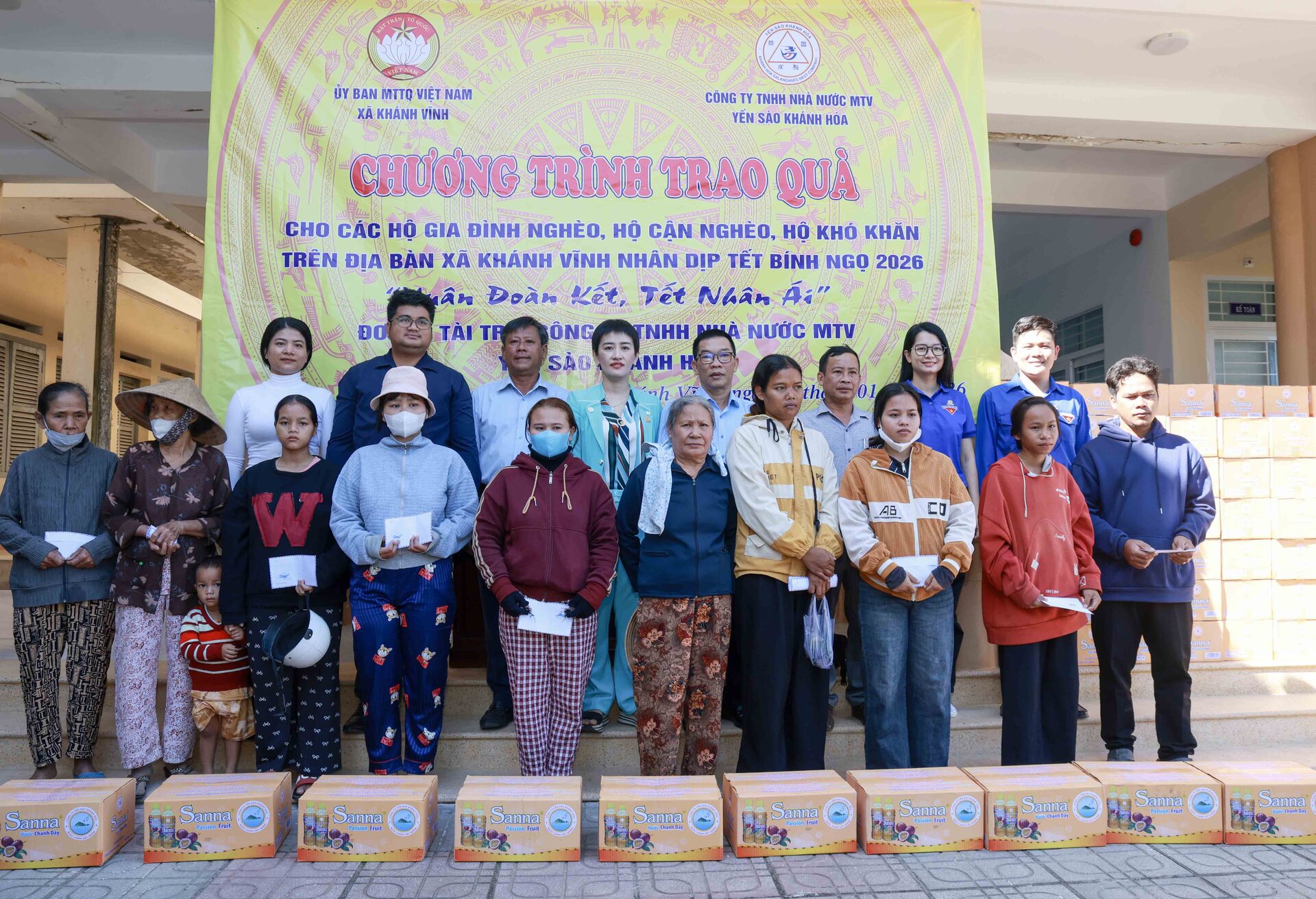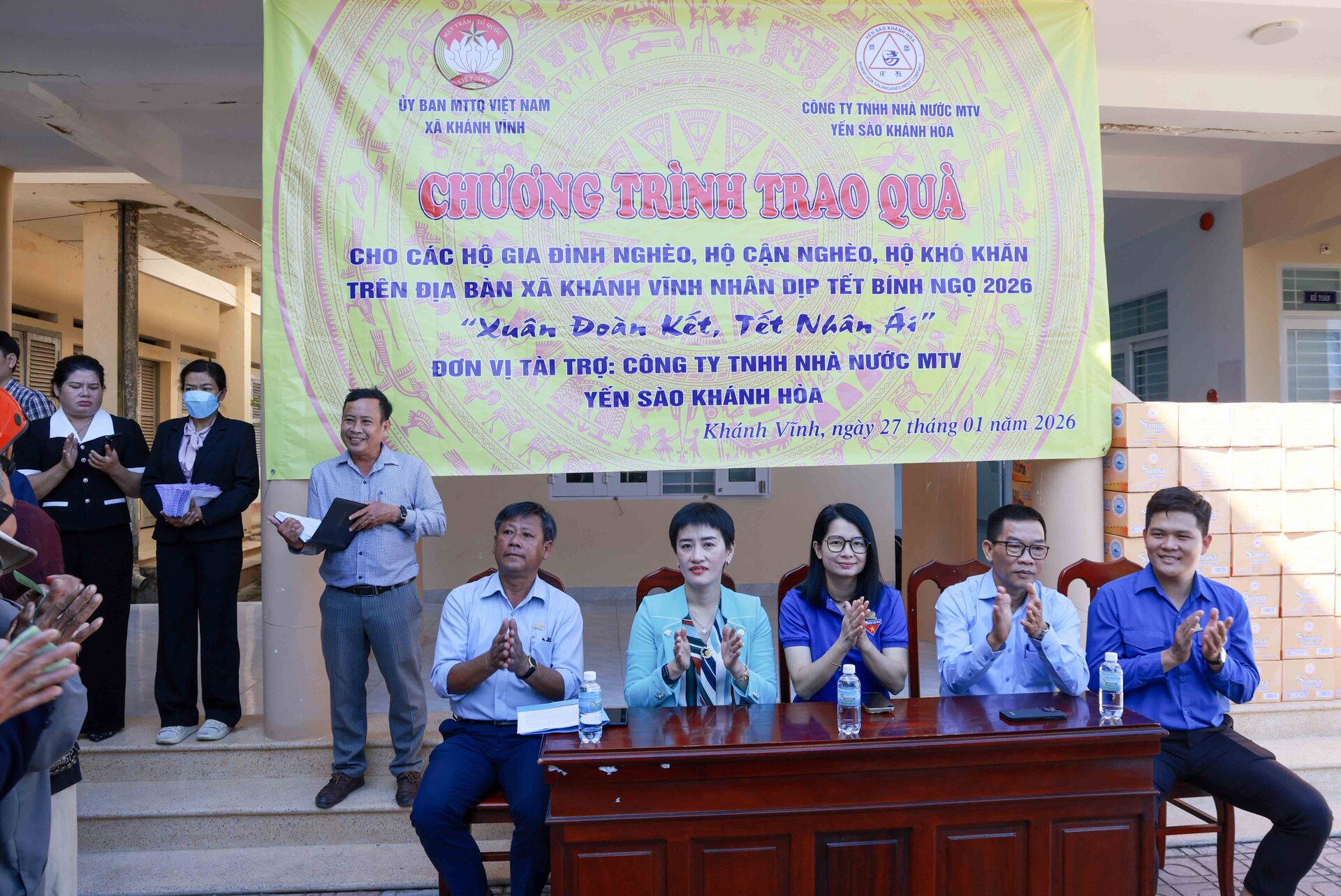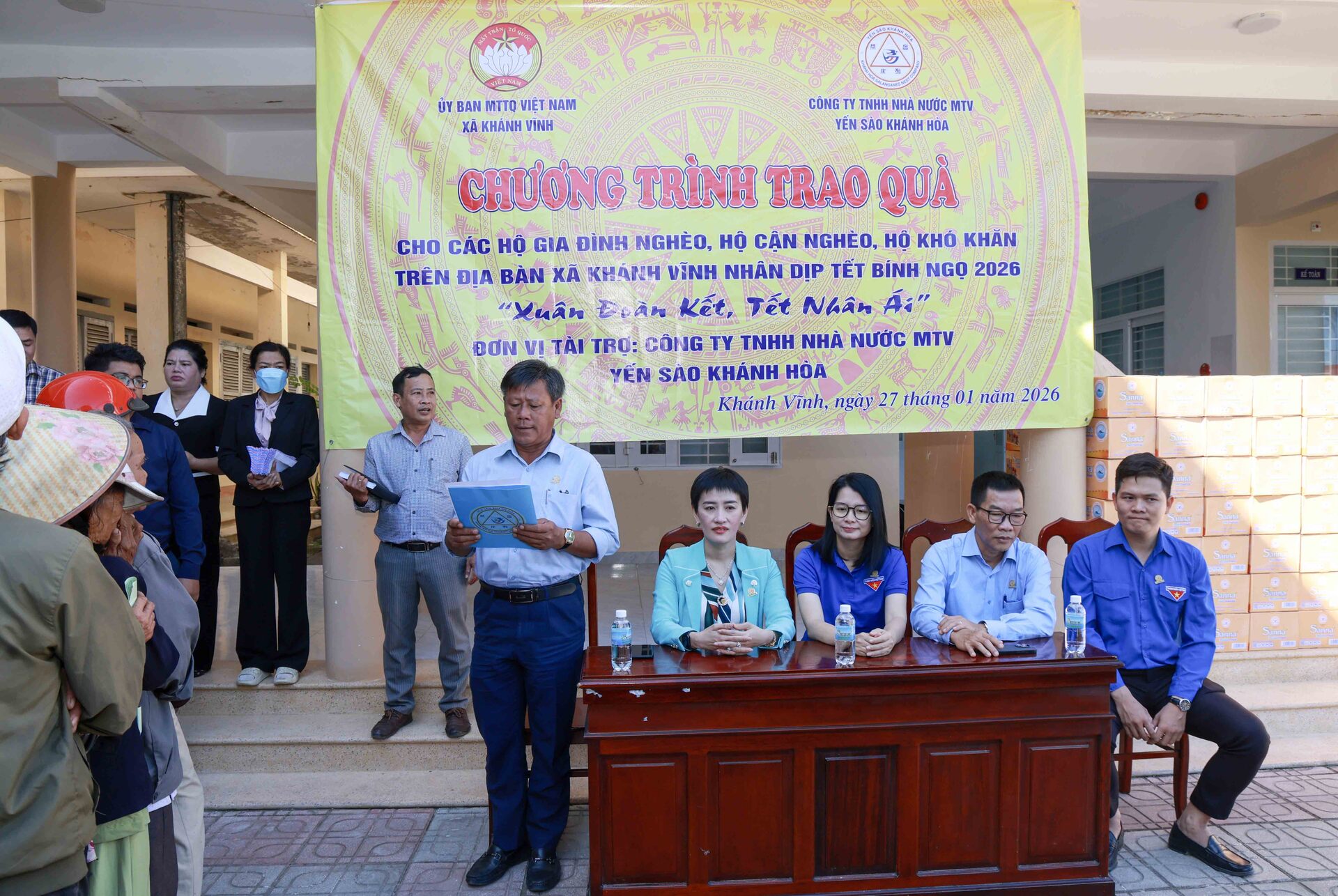 Theo đó, sáng ngày 27/01/2026, Công ty Yến sào Khánh Hòa phối hợp cùng Ban Thường trực Ủy ban MTTQ Việt Nam xã Khánh Vĩnh tổ chức cấp phát 300 suất quà, với tổng trị giá 150 triệu đồng dành tặng các hộ dân bị ảnh hưởng bởi thiên tai và có hoàn cảnh khó khăn trên địa bàn xã Khánh Vĩnh nhân dịp Tết Bính Ngọ 2026, với chủ đề “Xuân Đoàn Kết, Tết Nhân Ái”.