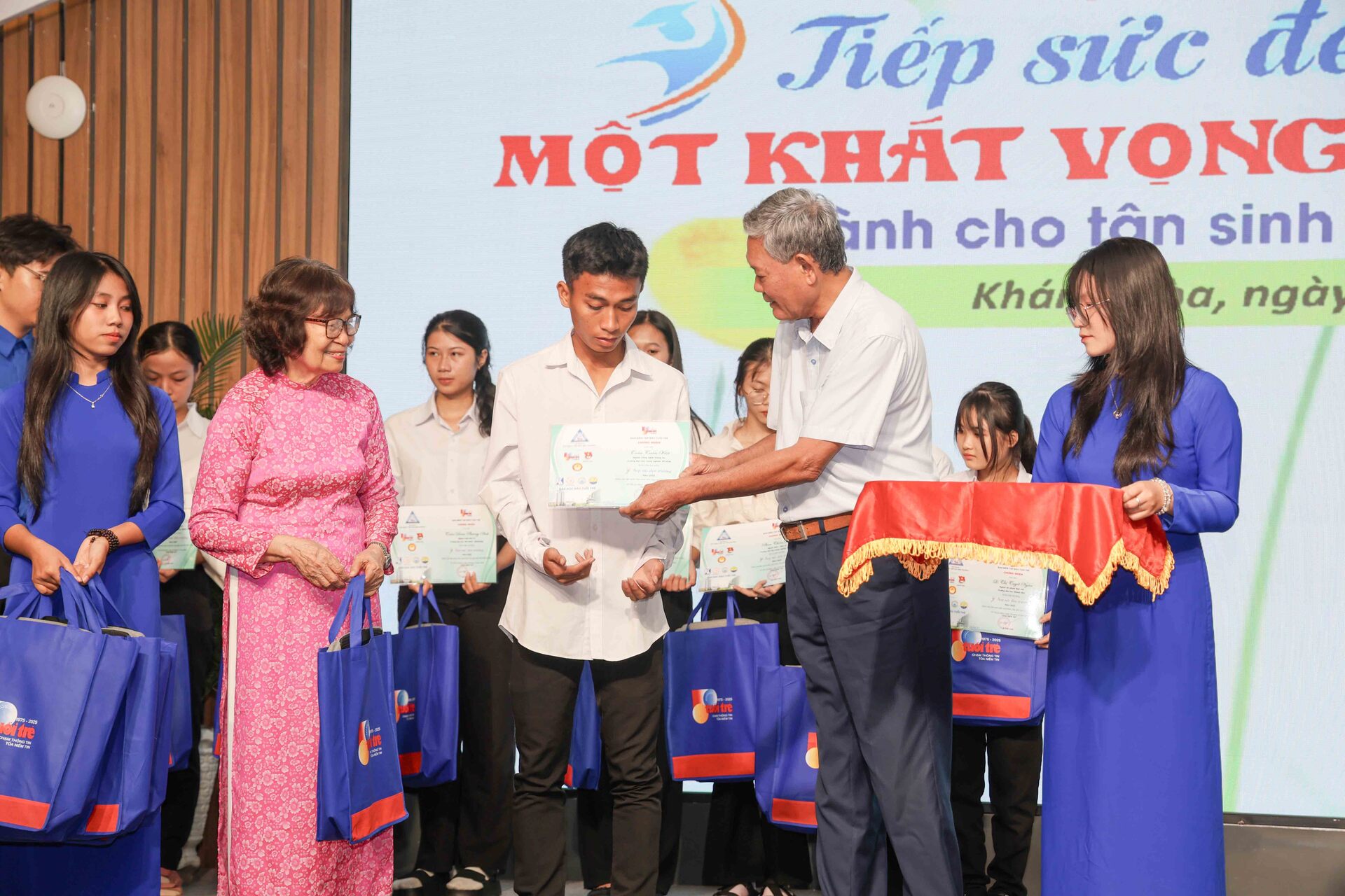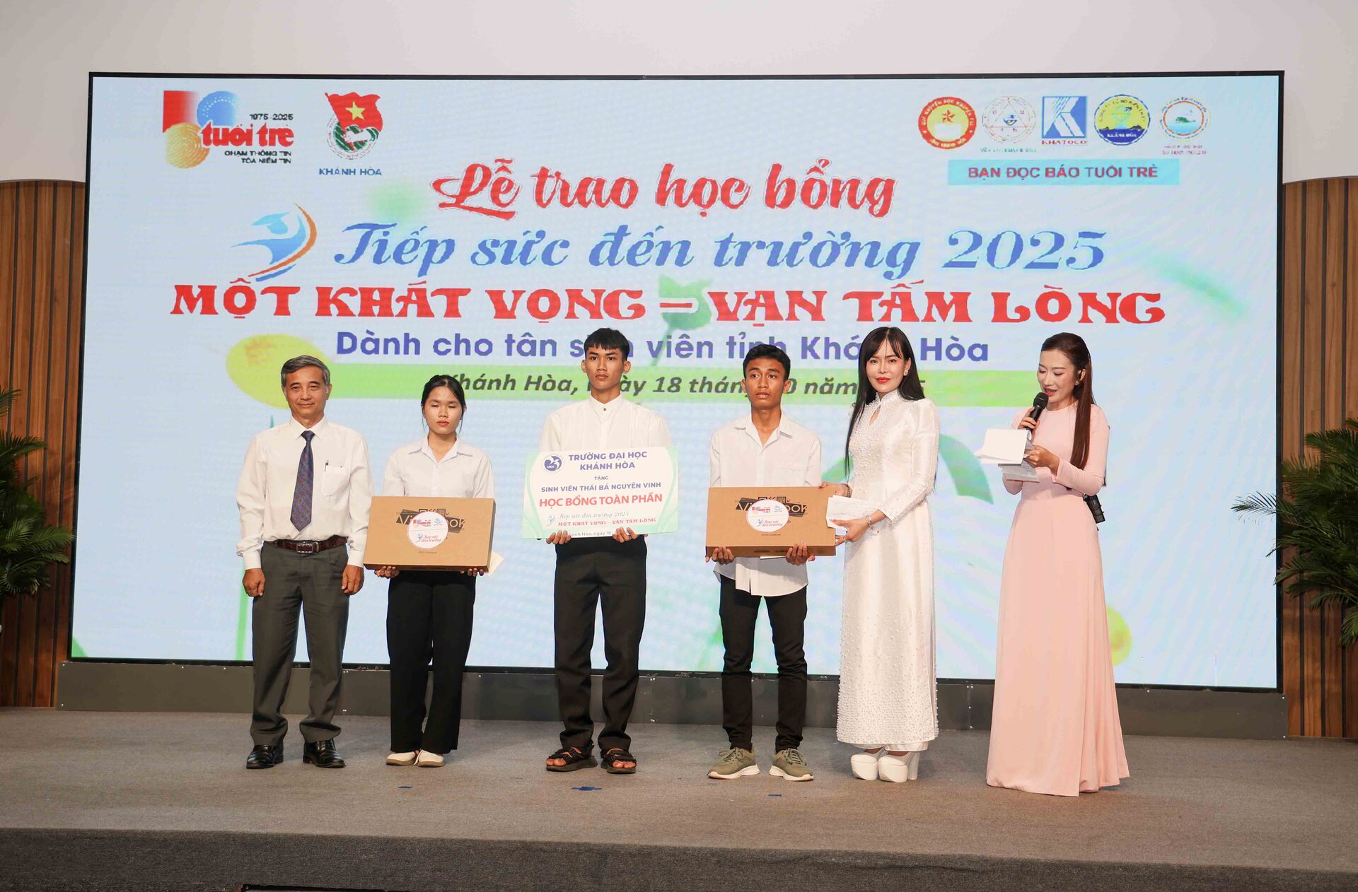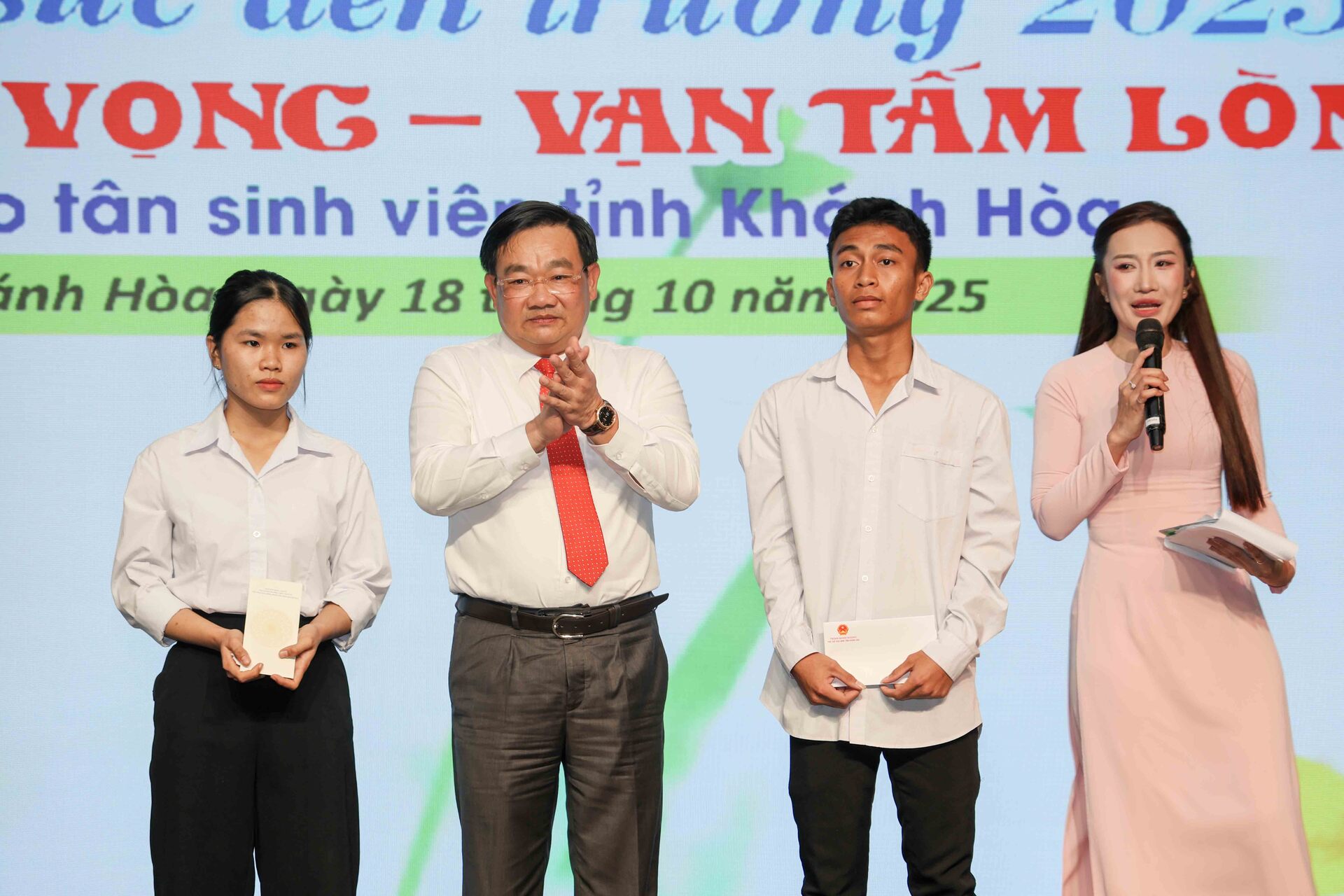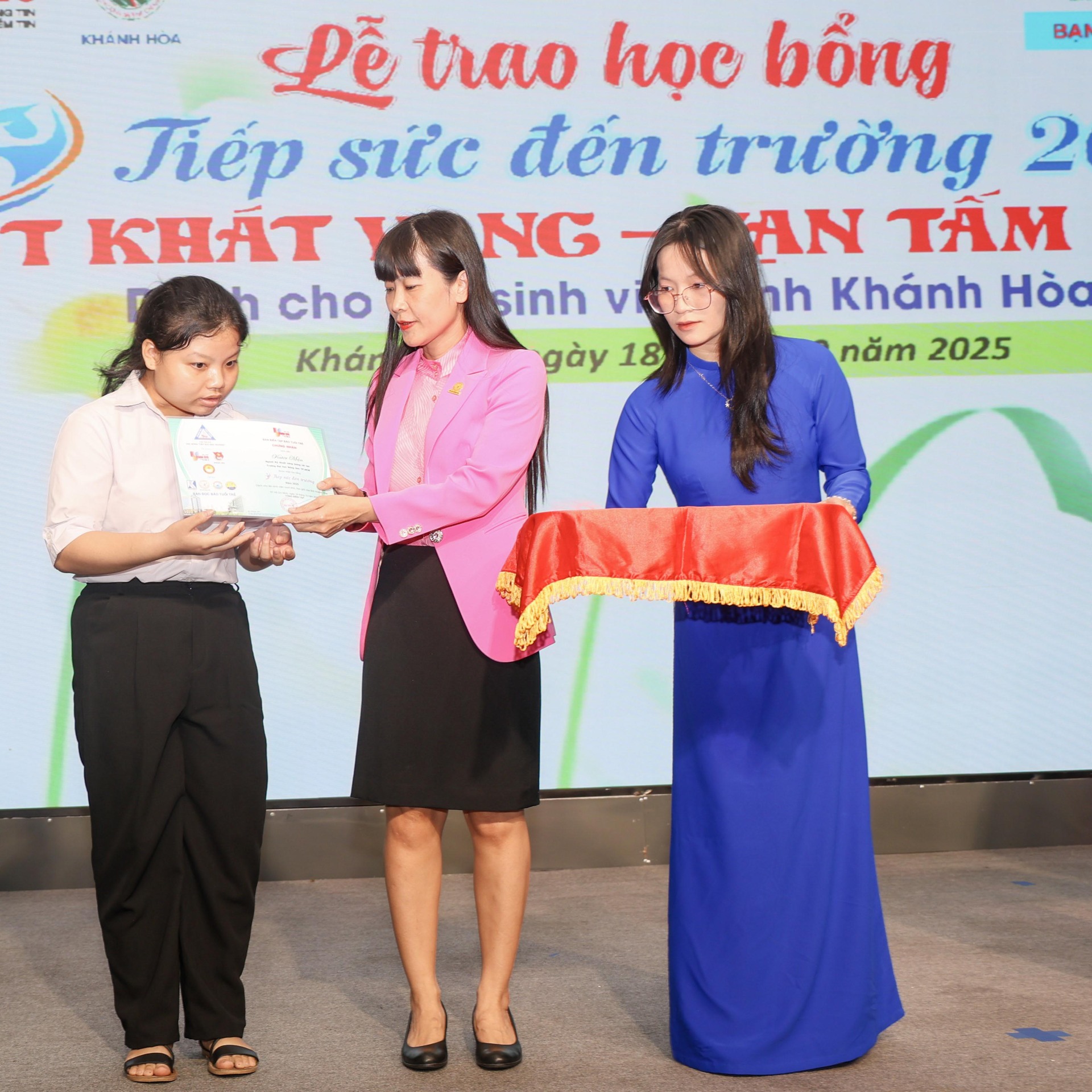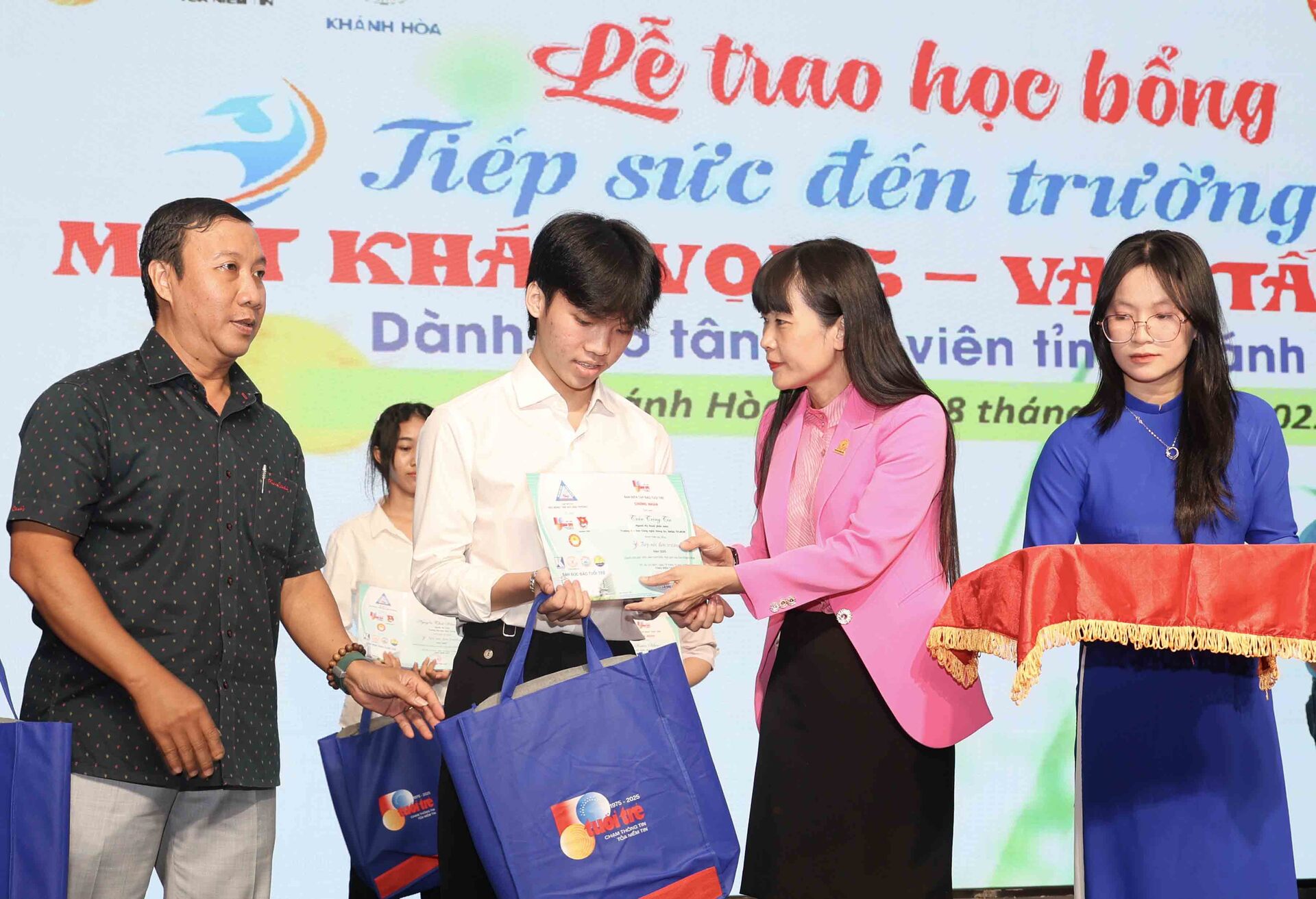 Tham dự sự kiện, Bà Trịnh Thị Hồng Vân - Chủ tịch HĐTV Công ty Yến sào Khánh Hoà đã trao học bổng tổng giá trị 225 triệu đồng cho quỹ học bổng, góp phần hỗ trợ tân sinh viên có hoàn cảnh khó khăn trên địa bàn tỉnh.