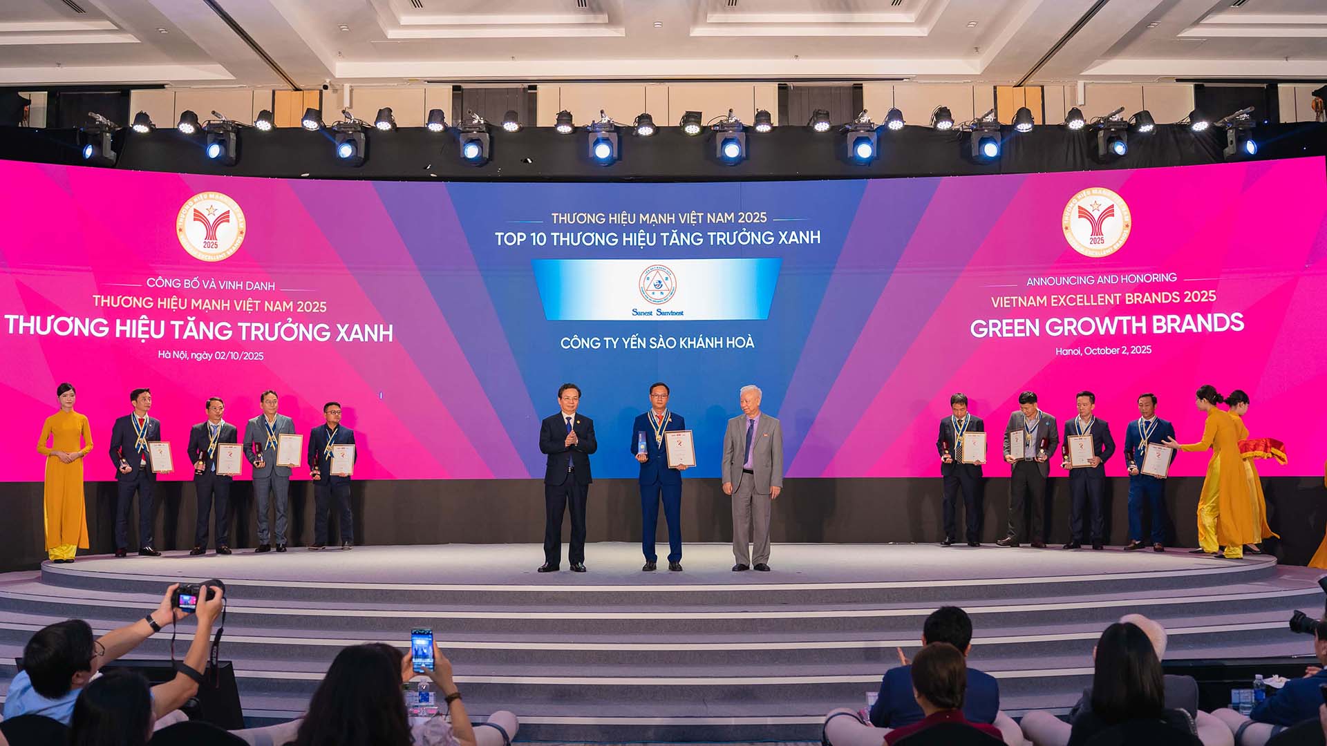 ???? Trong lễ vinh danh, Yến sào Khánh Hòa xuất sắc được trao giải Top 10 Thương hiệu Tăng trưởng Xanh 2025. Danh hiệu này không chỉ là sự khẳng định uy tín thương hiệu quốc gia, mà còn là minh chứng rõ nét cho chiến lược phát triển gắn với trách nhiệm xã hội, bảo vệ môi trường, thúc đẩy kinh tế xanh và bền vững.