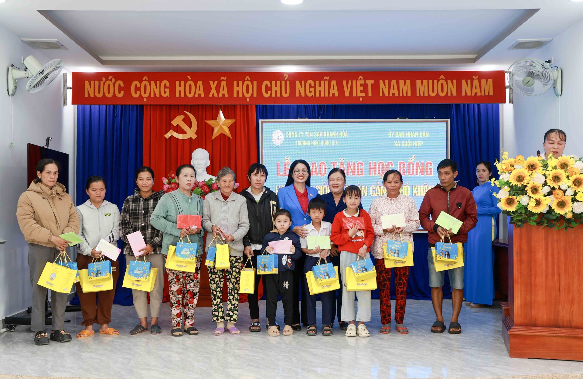 Tại đây, đại diện lãnh đạo Công ty đã ân cần thăm hỏi và trao tặng 20 suất học bổng cho các em học sinh nghèo hiếu học. Mỗi suất học bổng bao gồm hai triệu đồng tiền mặt và phần quà thiết thực (gồm sản phẩm Công ty và vở học). Số tiền trên được trích từ nguồn kinh phí dành cho hoạt động an sinh xã hội của Yến sào Khánh Hòa.