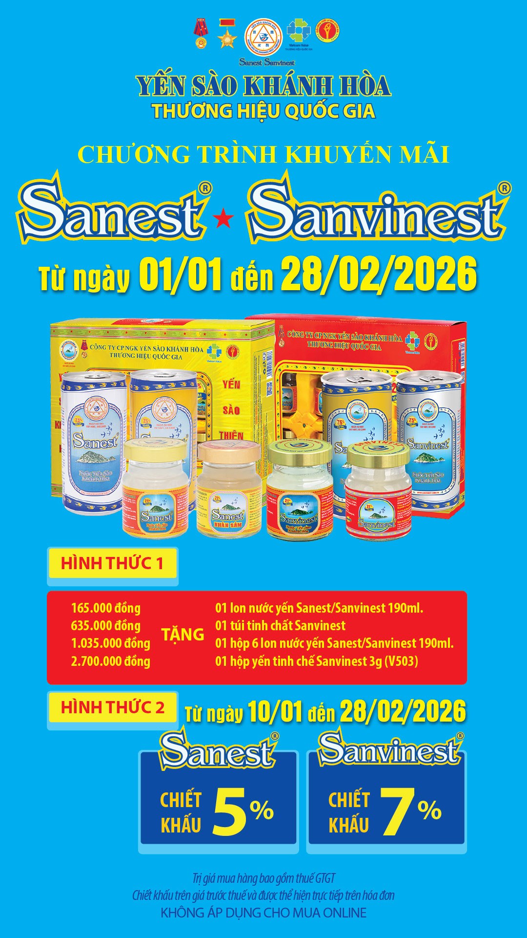 Chương trình khuyến mãi sản phẩm Nước Yến sào Sanest, Sanvinest áp dụng tại hệ thống Cửa hàng GTSP trực thuộc Công ty từ ngày 01/01/2026 đến hết ngày 28/02/2026