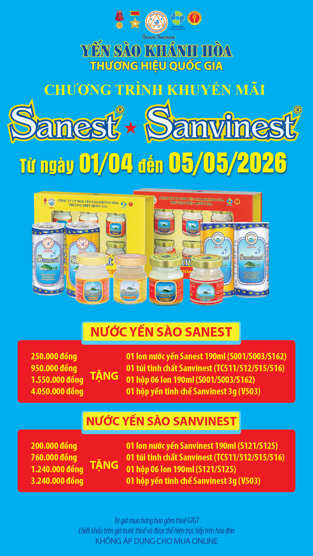 Chương trình khuyến mãi sản phẩm Nước Yến sào Sanest, Sanvinest áp dụng tại hệ thống Cửa hàng GTSP trực thuộc Công ty từ ngày 01/04/2026 đến hết ngày 05/05/2026